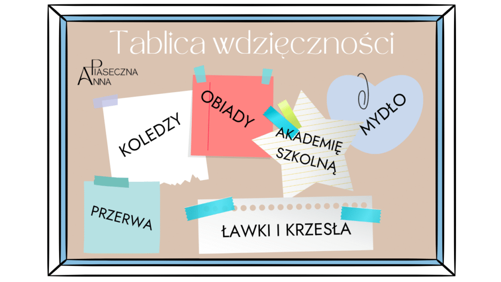 Proponuję również zrobić tablice wdzięczności – taką samą jak masz w klasie na ogłoszenia. W czasie lekcji uczniowie jak również nauczyciel przyklejają karteczkę z wdzięcznością.