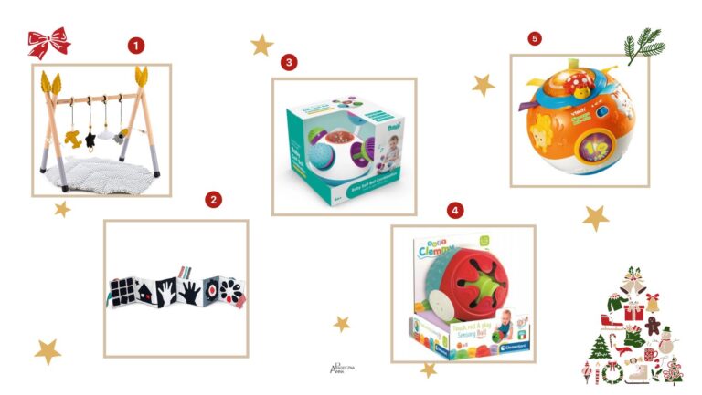 - Sensoryczna piłka Clementoni. Piłka jest podzielona na 4 części, każda z nich ma inny kolor i inną fakturę, aby stymulować zmysł wzroku i dotyku maluchów.